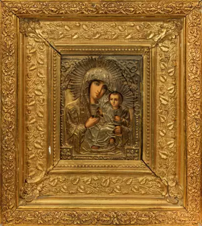 Ölmalerei auf Holz mit geprägtem Messingoklad. Die kleine Ikone ist in ein prachtvolles, mit vergoldeten plastischen Blattfriesen verziertes Kiot montiert. Kiot besch.; Ikone ca. 21 cm x 16 cm. Rahmen 45,5 cm x 40,5 cm.