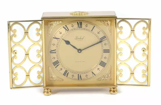 Лот 1224 | Imhof Tischuhr Schweiz, 20. Jh., Zifferblatt bez. ''Imhof/Striking'' m…