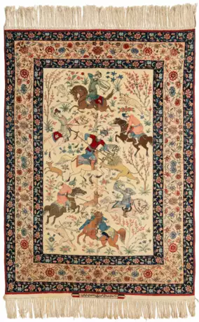 Z-Persien, um 1960. Kette aus Seide, Flormaterial feinste Korkwolle. Unten in der Mitte signiert mit "bestellt von Sadegh Seirafian, Iran, Isfahan". Im elfenbeinfarbenen Innenfeld figuriert ein Jagdmotiv mit Jägern auf ihren Pferden, flankiert von gestreuten Blütenvariationen, blühenden Bäumen, ausgefallenen Zeichnungen und verschiedensten Tieren. 2 nachtblaue, akkurat gezeichnete florale Borten säumen die beige Hauptbordüre, die mit gewirbelten Blattranken, geschmackvoll gefertigten Blüten und Floralmotiven stilvoll verziert ist. Sehr gute Erhaltung. 154x206 cm (ft. 5.1x6.8).