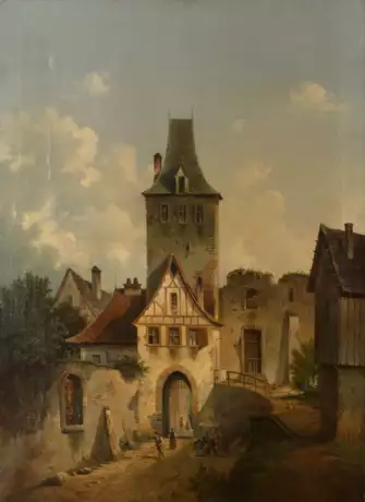 City view, oil on canvas, 100 x 73 cm canvas dimensions, craquelure, in need of cleaning, stained, with flaking, partially retouched