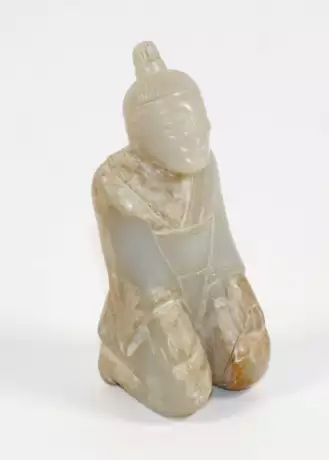 Junge. Aus blassgrüner Jade mit natürlichen braunen Sprenkeln. Reparaturstelle am Bein. Qing-Dyn. H: 8,5 cm.