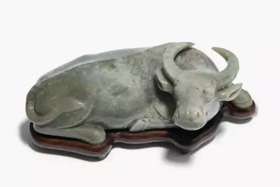 China, Anfang 20.Jh. Graugrüne Jade mit weissen und schwarzen Einschlüssen. Liegender Büffel. L 18,5, H 6 cm. Mit Holzsockel.