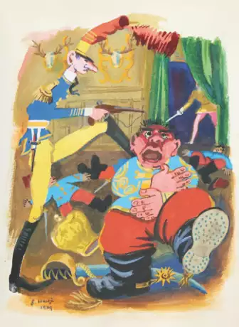 Nr. 1 von 10 Ex, der VA, gedruckt für Ernest Simon (GA 200 Ex.). Dieser Vorzugsausgabe beigegeben ist die Suite aller 25 OrLithos (davon 4 doppelblattgroß) in Schwarz/Weiß, 8 farbige OrLithos, die nicht in der Buchausgabe verwendet wurden sowie 1 farbige Vorzeichnung (Farbkreidezeichnung). - Monod 6397. Darüberhinaus enthält vorliegendes Exemplar weitere 4 OrFarblithographien von Heuzé, davon 2 im Unterrand mit Widmung an Ernest Simon; weiterhin 10 farbige Vorzeichnungen von Heuzé. Die farbige Deckelzeichnung stammt ebenfalls von E. Heuzé; er soll auch den Einband gefertigt haben. Außerdem eine eigh. Widm. m. U. des Illustrators an E. Simon und 2 eigenhändige Briefe mit U. von Januar und Februar 1949.