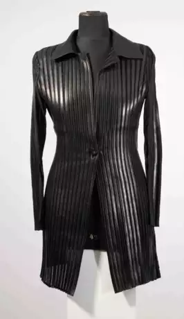 Jacke und Hose aus Lammleder in Schwarz. Feiner Streiffen-Dekor. Hose mit Reissverschluss und Jacke mit Knopfverschluss. Grösse (Jacke) 38 und (Hose) 36 Fr.