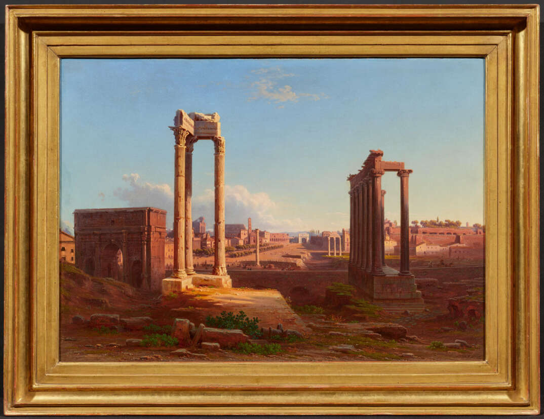 This combination of precise reproduction of Rome as a universal cultural site and fulfilment of the eternal longing for the south, the light and the life of Italy was the lifelong theme of Swiss painter Johann Jakob Frey. He was a master in this field and was highly regarded by both his contemporaries and today. From the mid-1830s onwards, he lived in Rome and explored the city and its surroundings together with the great painters Johann Anton Koch and Johann Christian Reinhard. He achieved great fame, recognition and appreciation among foreign travellers, the nobility and royal houses from 1845 at the latest, when he returned from a Prussian archaeological expedition to Egypt. The evening atmosphere at the Roman Forum shown here dates from 1859, at the zenith of his success, and displays his full painting perfection.