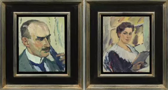 Das Bildnis der Frau, die von der Buchlektüre abgelenkt den Betrachter unverwandt ansieht, entstand 1919, kurz nach der Übersiedlung des Künstlers von Dresden nach Berlin. Aus der gleichen Zeit um 1920 datiert das unbezeichnete Männerbildnis. Beide lassen einerseits den Einfluß Cézannes und Liebermanns erkennen, zeigen aber zugleich die für Walter-Kurau typische Verschmelzung impressionistischer und expressionistischer Bildauffassungen. Die in Pastelltönen pastos gemalten, im Sinne des Künstlers ungefirnissten Bilder besitzen eine lebendige haptische Oberfläche. Walter-Kurau gilt als Mitbegründer der modernen lettischen Malerei. Er studierte an der Sankt Petersburger Kunstakademie und lernte 1906 in Paris den französischen Impressionismus kennen. Er verließ Russland und freundete sich in Dresden mit Otto Mueller an. 1917 ging er nach Berlin und schloss sich dem Kreis der Sezessionisten um Max Liebermann an. Öl/Karton. Eines r. u. sign. u. dat. (19)19. Ca. 26 cm x 20,5 cm. Rahmen.