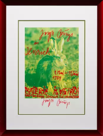 Farboffset/leichtem Karton, 1984. Mit rotem Faserschreiber sign.; Im Druck bez.; Plakat zur Ausstellung in der Galerie Ilverich, Meerbusch, vom 1. Mai bis 11. Juni 1984. Darstellung 39,5 cm x 29 cm. 51,8 cm x 35,5 cm (Passepartoutausschnitt). Rahmen.