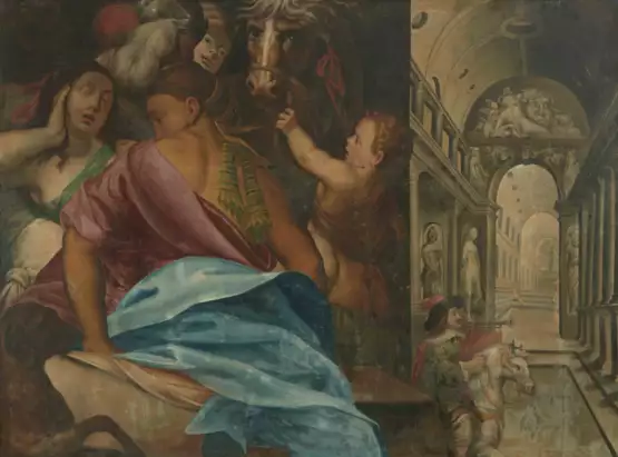 Das Gastmahl des Belsazar, wohl ein Ausschnitt. Öl auf Leinwand. Unten bezeichnet: Peetrus Andrichus pingebit (sic). 124,7x165,5 cm. Gerahmt.