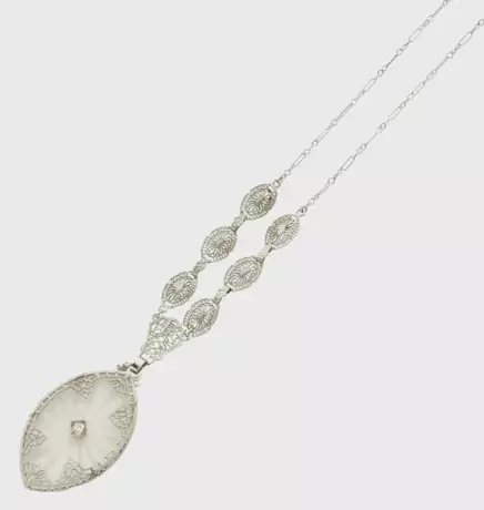 Weißgold, 8 ct.; Sehr feine, ornamental durchbrochen gearbeitete Collierkette, abschließender korrespondierender Anhänger aus facettiertem Glas, besetzt mit einem kleinem Altschliffdiamanten. Gew. ca. 8,66 g.