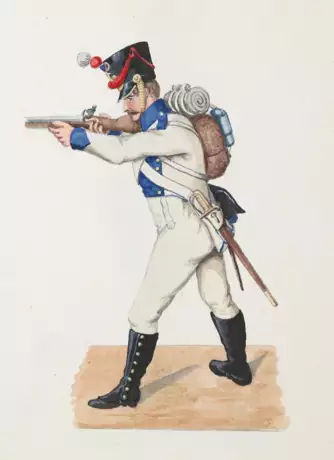 Vgl. Lipperheide Qdf 9 (ebensolche Folge von 18 Aquarellen), Colas 2641 u. 2930. - Schöne Folge von Aquarellen. Abbildungen von unter Jérôme Bonaparte als König von Westfalen 1810 eingeführten Uniformen, teilweise in Kopien nach einigen der 19 Darstellungen der Folge "Uniformes de la Garde de Sa Majesté le Roi de Westphalie" von Alexander Sauerweid. Das Königreich Westfalen bestand als Vasallenstaat Napoleons nur von 1807-1813. Abweichend von der oben genannte Folge von Sauerweid sind hier ausschließlich Soldaten der Infanterie dargestellt, sowohl solche der Garde als auch der gewöhnlichen Truppen, darunter Offiziere und Mannschaft. Die Blätter sind oben links wohl von der Hand des Künstlers nummeriert 1-18, unten überwiegend mit ebenso zeitgenössischer Bezeichnung des Dienstgrads mit Bleistift in deutscher Kursive versehen. Die 3 wiederkehrenden Wasserzeichen der Bögen: "DRESDEN" (103:15 mm), Wappen der Wettiner von 2 Löwen gehalten (97:123 mm) und Initiale "J" auf Wappenschild (89:78 mm) sind so nicht bei wasserzeichen-online nachweisbar. Die Uniformen der Cheveaux légers in der Version von 1812-13 dargestellt. Verso unten rechts mit kl. Sammlungsstempel "für" (nicht bei Lugt). Das Exemplar der Lipperheideschen Kostümbibliothek mit nahezu identischen Darstellungen, jedoch in anderer Reihenfolge. Lediglich die Darstellung "Eleve der Militair Schule zu Braunschweig" hier an Stelle "Oberst der Garde Chasseurs" enthalten. - Bll. 1-5 gering stockfleckig, sonst sauber und fleckenfrei.