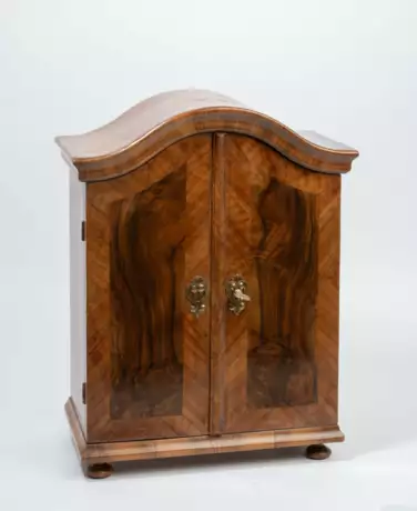 Mitte 18.Jh. Nussbaumholz. Dreiseitig gefriest und gefeldert furniert. Rechteckiger, zweitüriger Korpus auf gekehlter Sockelleiste und gedrückten Kugelfüssen. Vorkragender, geschweifter Kranz. Innen acht Schubladen und Geheimschublade. Messingbeschläge und originales Eisenschloss. Mit Schlüssel. 32x17,5x41,5 cm.