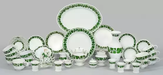 43-tlg.; Kanne, Sahnegießer, Zuckerdose, 10 Kaffeetassen mit 6 Untertassen und 3 runden Untertassen, 5 Dessertteller, Speiseteller, 3 kleine Durchbruchteller, Anbietplatte, Vierpassschälchen, Rundschälchen, 6 Mokkatassen mit Schwanenhenkel mit Untertassen, kleiner Sahnegießer, kleine Zuckerdose, 7 Kuchenteller, Vase, figürliche Saliere. Umlaufender Weinlaubdekor in unterglasurgrüner Malerei. Dekor-Entw. Johann Samuel Arnhold. Eine besch. Tasse als Beigabe. Wenige minim. best./rest.; Schwertermarke. Kannen-H. 13,5 cm.; Anbietplatte 35 cm x 25 cm.; Vasen-H. 23 cm.