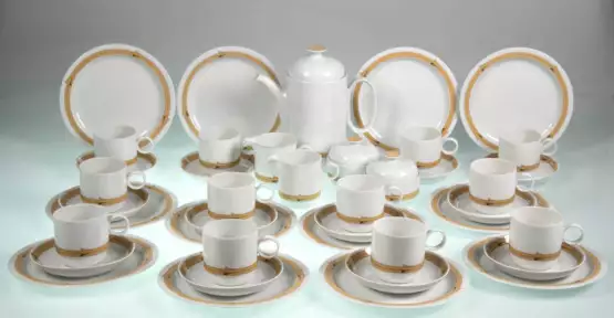 Лот 437 | Kaffeeservice für 12 Personen "Duo Indian Rice", Rosenthal studio-linie, 41-teilig, bestehend aus Kaffeekanne, 2 Zuckerdosen, 2 Sahnekännchen, 12 Kaffeetassen mit UT und 12 Kuchentellern