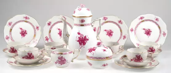 Лот 481 | Kaffeeservice für 6 Personen, Herend, Apponyi Purpur mit Goldpunkten und -rändern, 21-teilig, bestehend aus Kaffeekanne H. 26 cm, Sahnekännchen, Zuckerdose (Deckelblüte etwas best.), 6 Kaffeetassen mit UT und 6 Kuchentel…