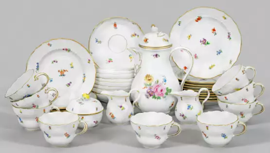 für 9 Personen. 22-tlg.; Kaffeekanne, Zuckerdose, zwei Sahnegießer, 9 Kaffeetassen mit Untertassen, 9 Dessertteller und dazu 3 kleine Kuchenteller. Reliefdekor "Neubrandenstein". Auf der Wandung und im Spiegel farbenprächtiger Streublumendekor. Polychrome Malerei mit Goldstaffage. Kanne erg. von Hutschenreuther. Wenige minim. best.; Schwerter- und Manufakturmarke. Kannen-H. 25,5 cm. Tassen-H. 7 cm.