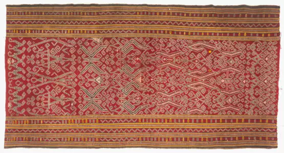 Borneo, 20.Jh. Baumwolle in Rot, Gelb und Schwarz. Sungkit-Webtechnik. Rock mit farbiger Glasperlen-Deko. 98x46 cm.