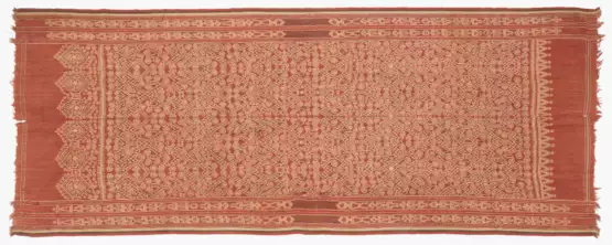 Borneo, Iban, 1.Hälfte 20.Jh. Baumwolle in Rot-, Beige- und Grüntönen. Ikat-Webtechnik. Zeremonialtuch aus zwei Bahnen, 203x82 cm (ohne Fransen).