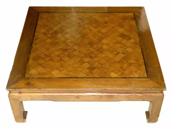 China wohl 19.Jh. Flacher Tisch mit nach innen gewölbten Füsschen. Tischplatte mit intarsiertem Schachbrettmuster. 33,5 x 91 x 91 cm. Alterssp.