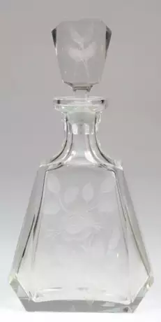 Лот 679 | Karaffe, achtkantiger Korpus und Stopfen mit floralem Mattschliff, H. 28 cm
