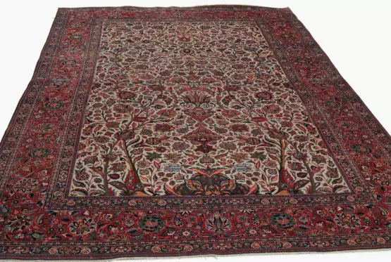 Z-Persien, um 1920. Dichtes florales Werk. Im elfenbeinfarbenen Hauptfeld figuriert eine blumengefüllte Vase, deren Blüten sich dekorativ über das gesamte Feld erstrecken, flankiert von filigran gearbeiteten, blühenden Bäumen, Palmetten und Blütenranken. 2 Rosettenborten säumen die reich gefüllte rote, mit alternierenden Palmetten prächtig belegte Hauptbordüre, die einen aparten Rahmen bildet. Gebrauchsspuren. 210x300 cm (ft. 6.9x9.9).