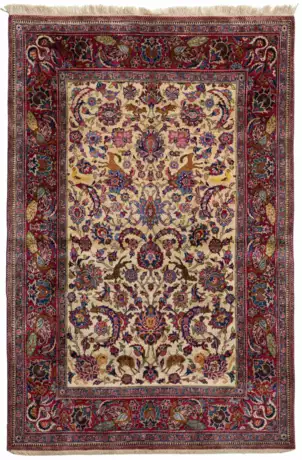 Z-Persien, um 1910. Flormaterial und Kette reine Seide. Das zartgelbe Innenfeld ist durchgehend mit girlandenartig verbundenen Palmetten in alternierenden Farbtönen, Gabelranken, Blütenkompositionen und Tieren in unendlichem Rapport prachtvoll geschmückt. 2 hellblaue filigrane Rosetten-Nebenbordüren säumen die dicht belegte rote Palmetten- und Blütenzweig-Hauptbordüre, die einen aparten Rahmen bildet. Sehr gute Erhaltung. 104x155 cm (ft. 3.4x5.1).