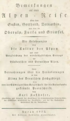 I) Waeber 60 - Barth 18054 - Dreyer 811 - Perret 2423.- II) Barth 18057 - Waeber 62 - Dreyer 811 - Perret 2422.- Beide Werke in erster Ausgabe.- Der seit 1806 als Oberförster des Berner Oberlandes wirkende Kasthofer (1777-1853) gilt als überragender Pionier der alpinen Forstwirtschaft und der Binnenkolonisation. In beiden Werken verbindet Kasthofer Beschreibungen der rhätischen Alpen mit Beobachtungen über Forst- u. Alpwirtschaft und stellt einen Bezug auf Klima, Geologie und Kultur der Alpen her. In seinen "Bemerkungen" verlangte er erstmals den Schutz der alpinen Vegetation vor den Eingriffen des Menschen.- Tls. etw. stockfleckig, Ebd. etw. berieben.