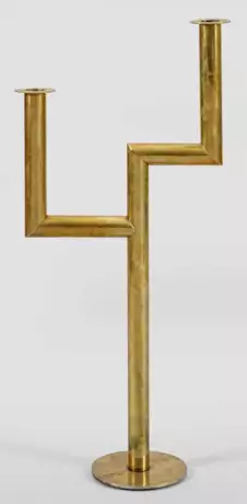 2-flg.; Messing, poliert. Über flacher, kreisförmiger Basis abgekanteter Rundschaft als Träger für Leuchtmittel. Unterhalb bez. Herstellerzeichen sowie Wortmarke "Werkstätten Hagenauer Wien". Entw. Franz Hagenauer als dreiarmiges Modell, um 1929. H. 57 cm.