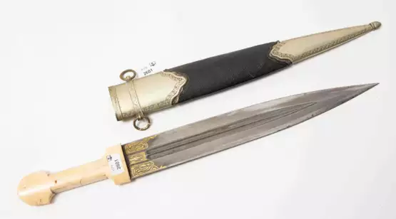 Kaukasusregion, 19. Jh. Charakteristisches Gefäss aus poliertem Walrosselfenbein. Zweischneidige Klinge, wohl aus Wootz, (L 32,5 cm) mit je zwei schmalen Mittelkehlen und floral mit Gold inkrustiertem (Koftgari) Ansatz. Lederbespannte Holzscheide mit Ortband und Mundblech aus Weissmetall oder Silber. L 45 cm.