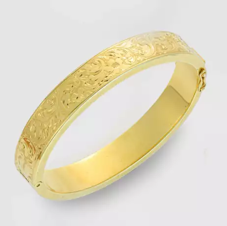 Gelbgold, gest. 585. Armspange mit graviertem, vegetabilem Zierband. D. ca. 7 cm. Gew. ca. 26,87 g.