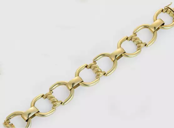Gelbgold, gest. 585. Breite Bandform aus steigbügelförmigen, teilw. satinierten Gliedern. L. ca. 8 cm. Gew. ca. 38,05 g.