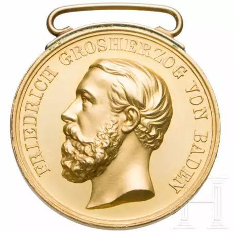 Gold (getestet). Fein reliefiertes Portrait Großherzog Friedrichs (ohne Stempelschneider). Rs. Kranz aus Eichenlaub, im Zentrum "Für Verdienst". Angelötete Bügelöse. Trage- und Altersspuren.