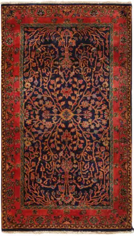 Indien. Wolle auf Baumwolle. Im dunkelblauen Innenfeld flächendeckende Musterung aus arabesk angeordnetem Rankenwerk. Umlaufend rote Blütenbordüre. 128 cm x 75 cm.