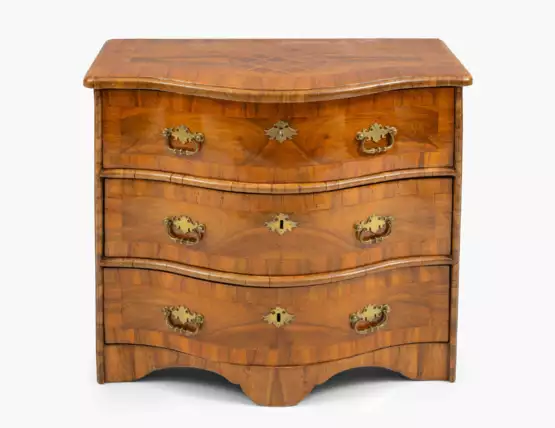 Bern, 18.Jh. Nussbaumholz gefriest und gespiegelt furniert. Dreischübiger, frontal stark gebauchter Korpus mit gerundeten Traversen. Passig ausgeschnittener Sockel. Messingbeschläge. 82 x 48, Höhe 73 cm.