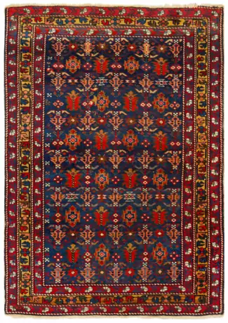 Kaukasus. Wolle auf Wolle. Im blauen Innenfeld flächendeckende Musterung aus stilisierten Palmetten im Rapport. Umlaufend breite, mehrteilige Bordüre aus Blütenbändern. Rest.; 125 cm x 88 cm.