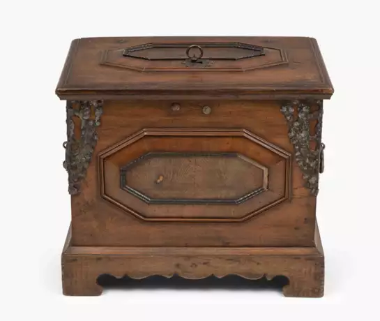 Um 1700. Nussbaumholz. Rechteckiger Korpus auf passig ausgeschnittenem Sockel. Die Füllungen mit Flammleisten eingefasst. Aufklappbarer Deckel. Reich verzierte, verzinnte Eisenbeschläge und Schloss. Die Ecken mit Eisenbeschlägen und seitlich eisengeschmiedeten Traggriffen. 62 x 40, Höhe 54 cm.