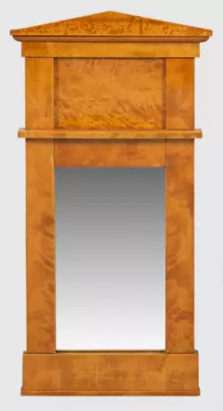 Birkenholz, furniert. gerade, hochrechteckige Spiegelrahmung mit breitem Giebelfeld und flachem Dachabschluss. 86,5 cm x 45 cm.