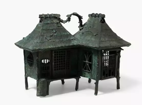 Südostasien. Bronze. In Pfahlbau-Hausform gestalteter Schrein mit beweglichen Türen. L 38, H 31 cm.