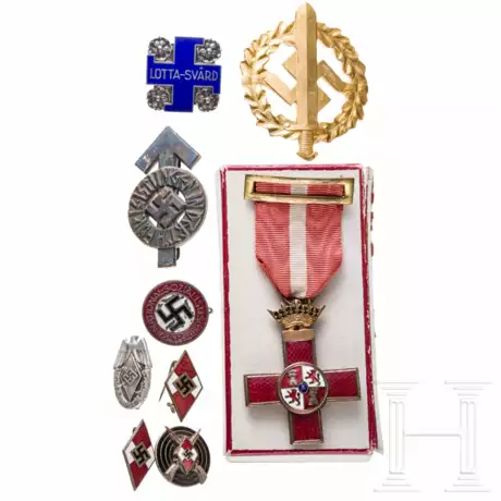 HJ-Leistungsabzeichen in Silber (B-Stück, Cupal?), HJ-Schießauszeichnung, zwei HJ-Abzeichen, SA-Sportabzeichen (Nadelsystem ergänzt, nachvergoldet - needle system supplemented, re-golded), eine finnische Lotta-Svärd-Brosche und ein spanisches MVK.