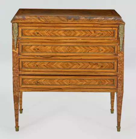 Nussbaummaser, furniert. Gerader, querrechteckig angelegter Korpus auf konischen Vierkantbeinen. In der gegliederten Front vier flache Schubladen. Geschweift ansteigende Deckplatte. Besch.; H. 83 cm. 80 cm x 38 cm.