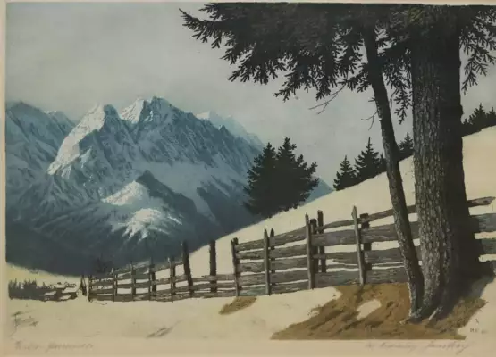 U.a. vorhanden: Ansicht von Gießen (Otto Ubbelohde), Altonaer Fischmarkt (Friedrich Kallmorgen), Bei Karlsruhe (Carl Ludwig Frommel), Winter Garmisch (Hans Frey), Grinzinger Pfarrkirche u. Stephansdom in Wien u. eine weitere Ansicht (Robert Kasimir), Blick über die Dächer von Wien (Luigi Kasimir), Baad (M.Tahrreis), La Maison Pfister in Comar (William Adolphe Lambrecht), St. Peter in Salzburg (Josef Eidenberger).