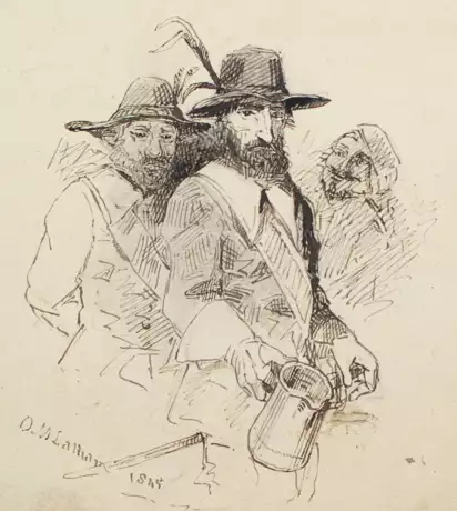 ╔U.a. vorh.: Oliver Mathew Latham╗ (19. Jh.). Gruppe dreier Herren, einer davon den leeren Trinkkrug präsentierend. Tuschfederzeichnung über Bleistift 1845. Ca. 12,0 x 9,5 cm. Sign. u. dat. unt. li. Verso in Bleist. der Name "Oliver Matthew Latham" aufgelöst. - ╔Künstlerbrief╗. Hosenloser Herr ruft aus "Vivat hoch die edle Katharina". Brief des Neffen Carl aus Landstuhl anlässl. d. Namenstages seiner Tante Catharina, der er dankt, m. Randillustration. Tuschfeder über Bleistift 1856. Ca. 8,3 x 7,4, Blgr. ca. 18,2 x 16,5 cm. Mehrf. gefaltet u. m. Rissen entl. d. Knicksp. sowie weiteren Randausrissen. - ╔Arthur Rappl╗ (1904 Nürnberg - Kalchreuth 1968). 4 Landschaftsdarst. Aquarelle über Bleistift bzw. Bleistiftzeichnungen 1.H. 20. Jh. Zw. ca. 15,5 x 10,5 u. 20,5 x 29,6 cm. 2 Bl. monogr. 2 Bl. m Zuschr. auf gemeinsamem Trägerkart. - ╔Klassische Moderne╗. Komposition, u.a. in Rot, Schwarz u. Blau. Kreidezeichnung 20. Jh. Ca. 9,0 x 11,9 cm. Undeutl. sign. unt. li. Es liegt eine Farbkopie des Bl. bei. - Meist Gebrauchssp. 1 Bl. m. Eckabriss. - Insg. 9 Bl.