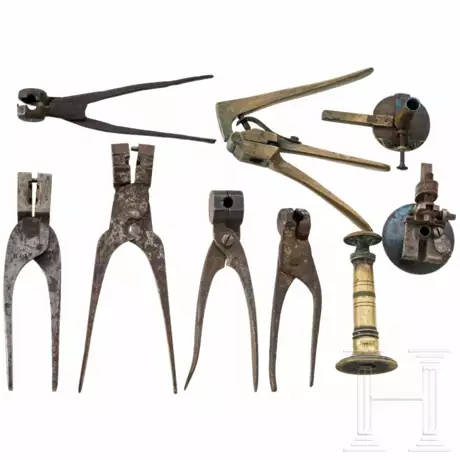 Mixed lot with diopters, bullet molds, a ball starter and a set of pliers, 19th century