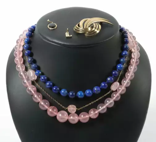 Лот 1316 | Konvolut Schmuck 20. Jhr., bestehend aus 3 Ketten, 1 Brosche, 2 Anhäng…