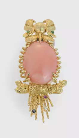 Gelbgold, gest. 18 k. Zentral besetzt mit einem Engelshaut-Korallencabochon in Ajour-Arbeit, akzentuiert von einem kleinen Brillanten, Saphir, Rubin und zwei Smaragden. Gew. ca. 23,25 g.