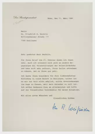Ca. 1 an F. Bechtle gerichtete eigenhändige Briefe, 22 maschinenschriftliche Briefe, 5 eigenhändige Post- und Grußkarten, 24 maschinenschriftliche Karten mit Unterschriften sowie 1 Briefdurchschlag von Bechtle. Diverse Orte, 1960-1990. Zusammen ca. 58 S. Verschiedene Formate, Briefe meist DIN A4. Enthält: Siegfried Balke: 1 Karte, 1967; , Rainer Barzel: 2 Briefe, 1 Karte o. Unterschrift, 1971/72; Inge Buback: 1 Karte, 1977; Walter Hallstein: 4 Briefe, 10 Karten, 1962-72; Kai-Uwe v. Hassel: 3 Karten, 1963/69; Karl-Günther v. Hase: 2 Briefe, 4 Karten, 1962-69; Hans-Heinrich Herwarth v. Bittenfeld: 1 Brief, 1965; Richard Jaeger: 2 Briefe, 4 Karten, 1963-66; Heinrich Krone: 3 Briefe 1x mit Durchschlag Brief Bechtle u. "Fuchsbrief XV/61", Bonn, 1961/62; Hans Kilb: 1 Brief und 3 Karten, 1961/65, Ludwig Martin: 2 Briefe, 2 Karten 1966-69; Kurt Rebmann: 1 Brief, 1981; , Volker Rühe: 1 Brief, 1992; Hans-Jochen Vogel: 1 Brief, 1 Karte, 1960/87; Richard v. Weizäcker: 2 Briefe, 1984-85; Hans-Georg Wieck: 1 Brief, 1990. Minim. Alters- und Gebrauchsspuren, minim. Risse.
