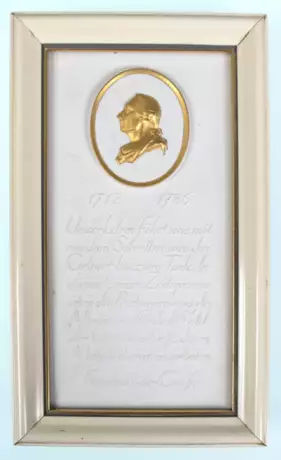 Лот 471 | KPM-Wandrelief "Friedrich der Große", mit Zitat, Biskuitporzellan, mit Goldstaffage, im Rahmen, ges. 20x11,5 cm