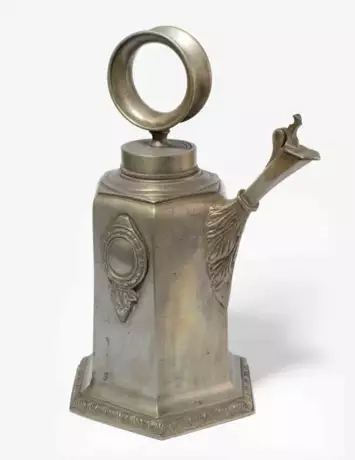 Chur, 1.H. 19.Jh. Zinn. Marke und Bodenrosette (Schriftrand tlw. abgedreht) des Johann Baptista Bawier (1770–1842). Sechsseitig. Ringhenkel mit Schraubverschluss. Profilierter Bodenrand mit Blätterfries. Ausguss-Ansatz mit gegossenem Akanthusdekor. Ovales Schild reliefiert, Lorbeerkranz mit Trauben-Abschluss. H 34,5 cm. Dazu: Broschüre "Schweizer Zinnkannen", Kulturgeschichtliche Studie von Dr. med. Gustav Bossard, Beilage zum Jahrbuch S.A.C., Band XLIII.