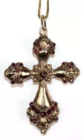 Лот 866 | Kreuz-Anhänger, 585er GG (geprüft), besetzt mit 37 Granatsteinen, vollplastisch reliefiert gearbeitet, beidseitig tragbar, Ges.-Gew. 6,49 g, L. (mit Öse) 5,4 cm, dazu Venezianische Kette, 585er GG, 2,88 g, L. 44 cm