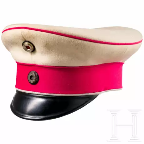 Weißes Wolltuch mit karmesinrotem Vorstoß und Besatz. Offizierskokarden, schwarz lackierter, innen rotbrauner Lederschirm. Feines hellbraunes Lederschweißband. Weißes Seidenfutter mit goldener Königskrone im Deckel. Stempel "Kostümfundus Kassel", das Tuch leicht verschmutzt, kleinere Mottenschäden, ansonsten in formschöner und farbfrischer Erhaltung. Der Vorstoß und das Besatztuch in identischer Ausführung wie bei dem folgenden Koller des Kronprinzen.