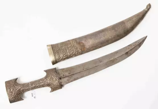 Balkan, Albanien, 19. Jh. Symmetrisch doppel-T-förmiges Gefäss ganzflächig mit floral getriebenem Silberblech verkleidet. In den Vertiefungen noch Reste der ursprünglichen Vergoldung. Geschwungene, blanke Gratklinge (L 34,2 cm) mit hohl geschliffenen Flächen. Stellenweise einsetzende Korr., Verarbeitungstextur nicht sichtbar. Holzscheide en suite aus ursprünglich vergoldetem Silberblech mit geometrischem und floralem Dekor. L 52 cm.